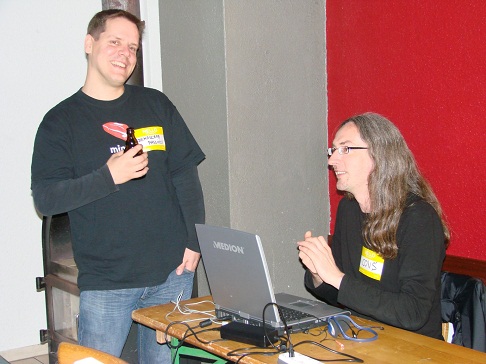 At around 19.00 hours, SunSpire came back with the shirts that had been delivered to Bremen train station by a colleague of Topy's. There was quite a quarrel around the shirts, starting with hardly being able to choose a motif, going over to keeping the price reasonable and ending with printing and delivery problems. But in the end, everyone seemed happy. Right after that the beamer was set up and the sound-system started. The big-screen actually wasn't that big, but the sound-system was huge and could have been used on a stage or in a stadium. Crazy. I tried to work on my things then, but the almost filled place and the constant noise made it really hard to concentrate. So finally I gave in and switched to party visitor mode completely.